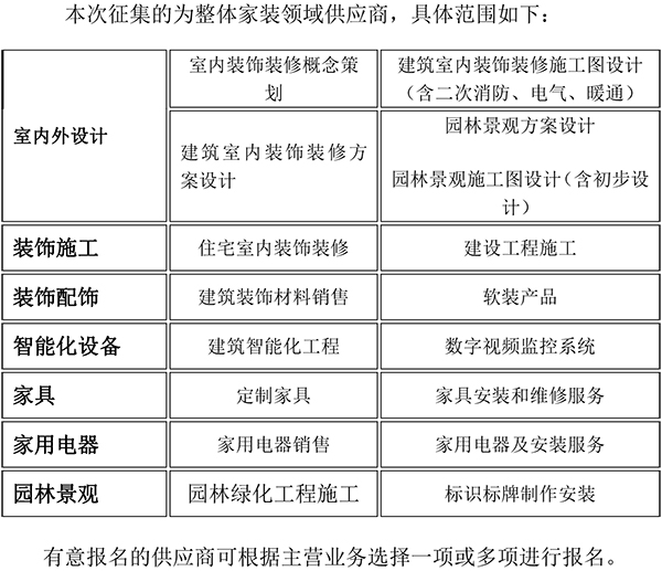 为补充湖北福汉木业(集团)发展有限责任公司装饰设计、装饰装修、家具、家用电器等各类整体家装领域供应商资源,充分发挥和利用社会资源,现公开征集整体家装领域各类供应商,欢迎符合条件的供应商报名登记。现将有关规定通知如下: